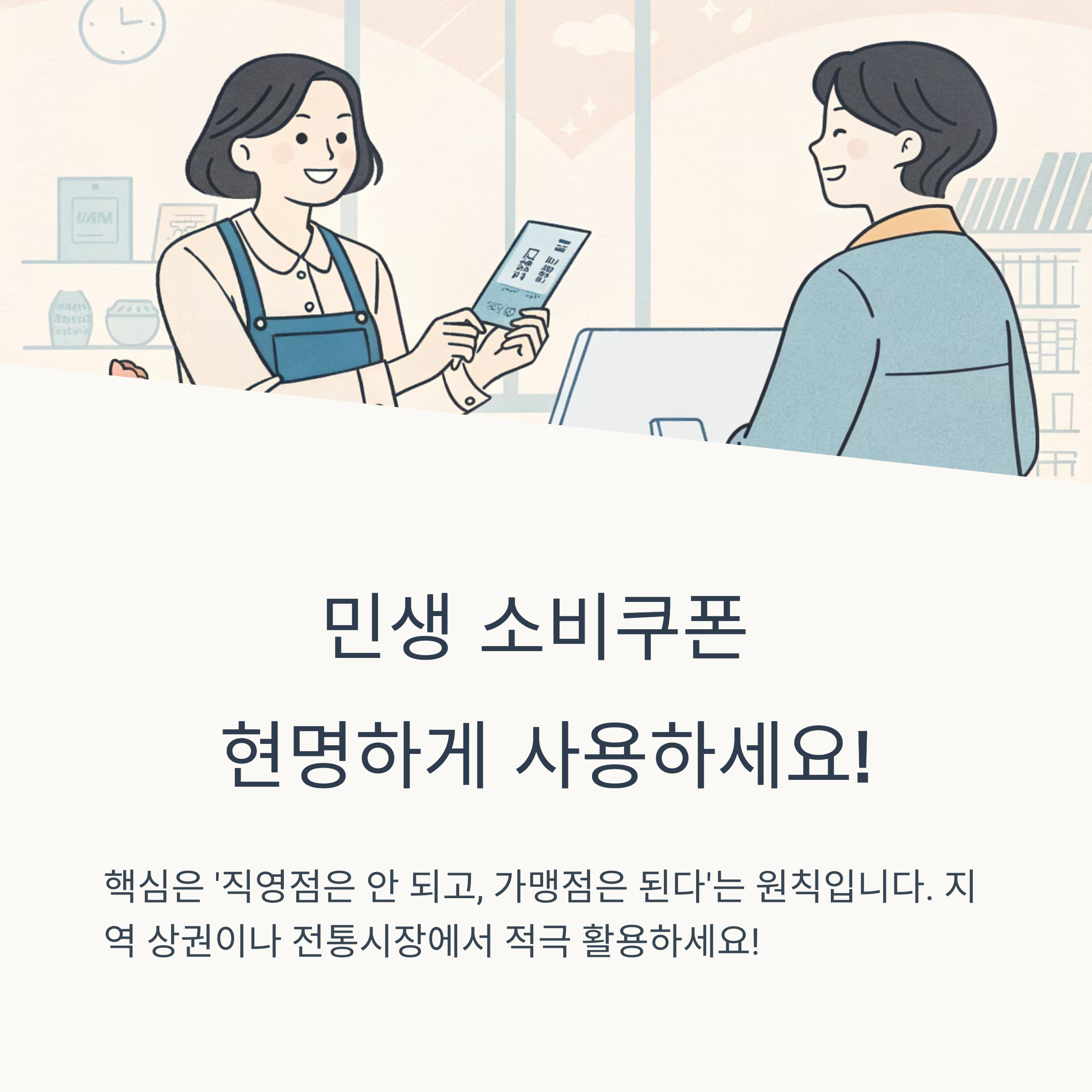 민생 소비쿠폰의 핵심은 '직영점은 안 되고, 가맹점은 된다'는 원칙입니다. 평소 자주 이용하는 매장이 직영점인지 가맹점인지 미리 파악해두시면 당황하지 않고 효과적으로 사용할 수 있습니다.