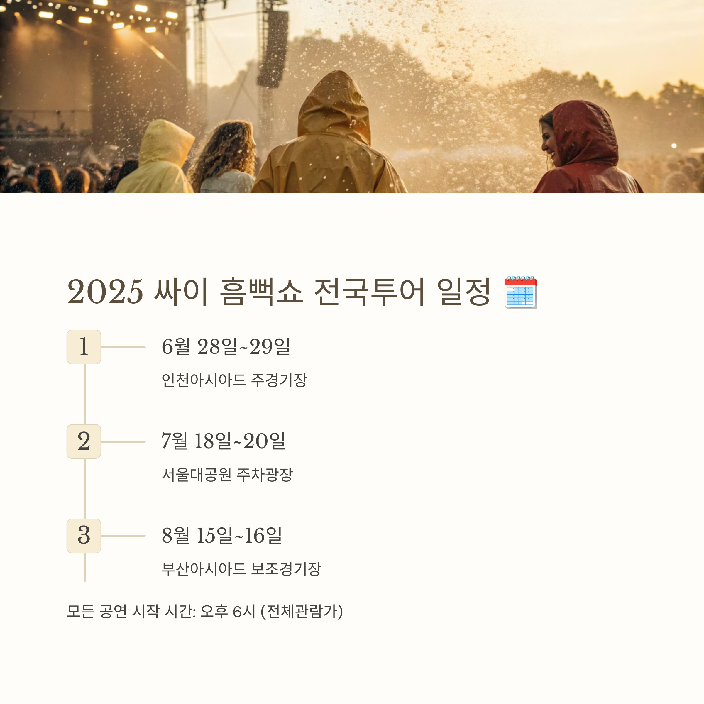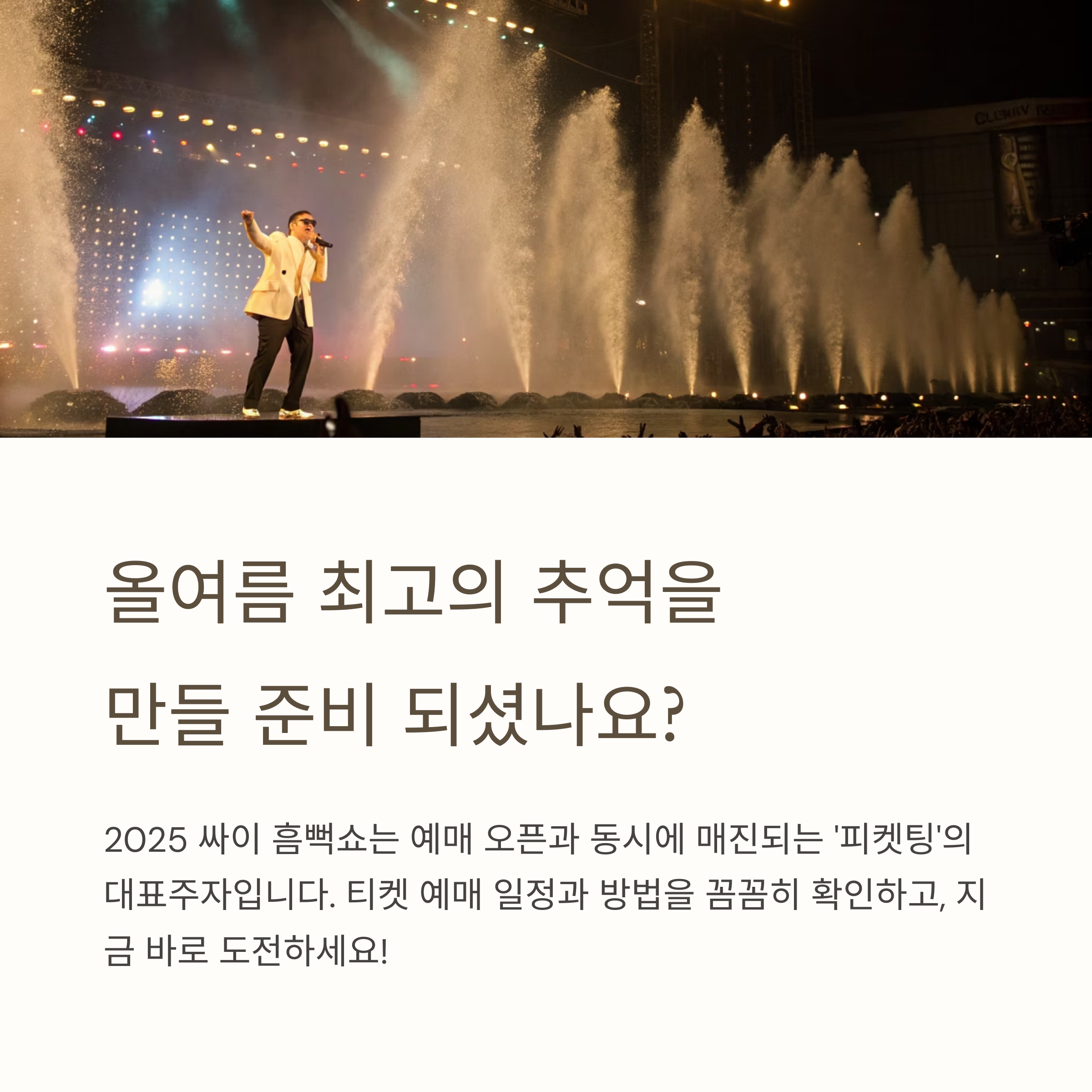 2025년 싸이 흠뻑쇼는 예매 시작과 동시에 매진이 예상되는 대표적 피켓팅 콘서트입니다.