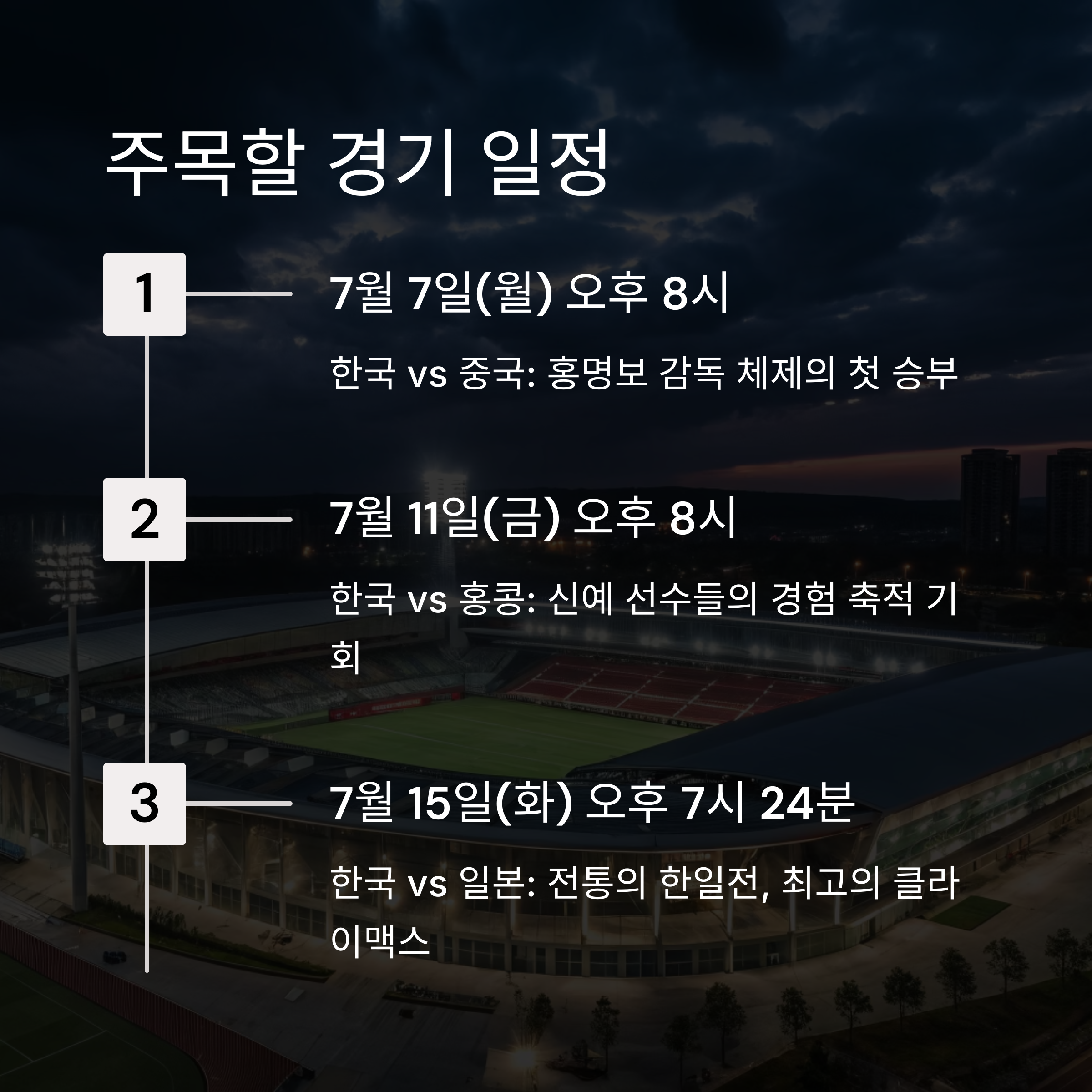 더욱 흥미로운 점은 마지막 경기인 7월 15일 한일전입니다. 전통의 라이벌 일본과의 대결은 언제나 뜨거운 관심을 받죠. 홍명보 감독이 이끄는 새로운 한국 축구의 청사진을 확인할 수 있는 절호의 기회입니다.