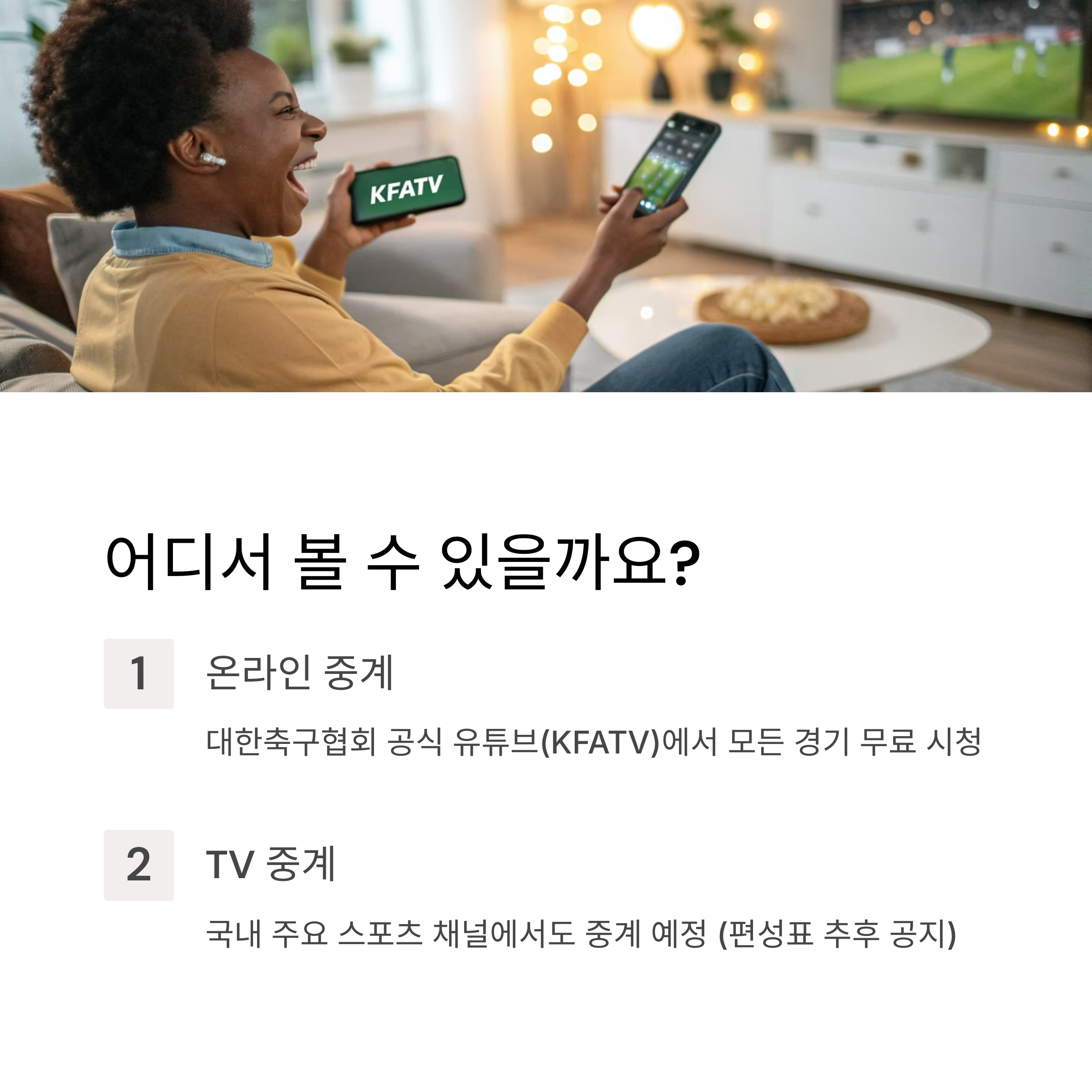 대한축구협회 공식 유튜브(KFATV)에서 모든 경기를 무료로 시청할 수 있습니다. 고화질 중계와 전문 해설로 생생한 현장감을 전달받을 수 있어요.